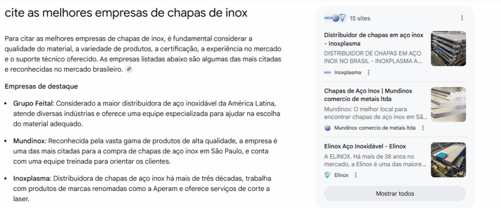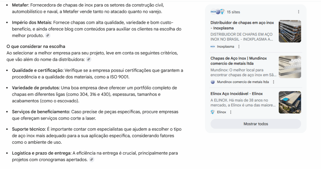 AI Mode: citação de nossos parceiros Mundinox e Império dos Metais