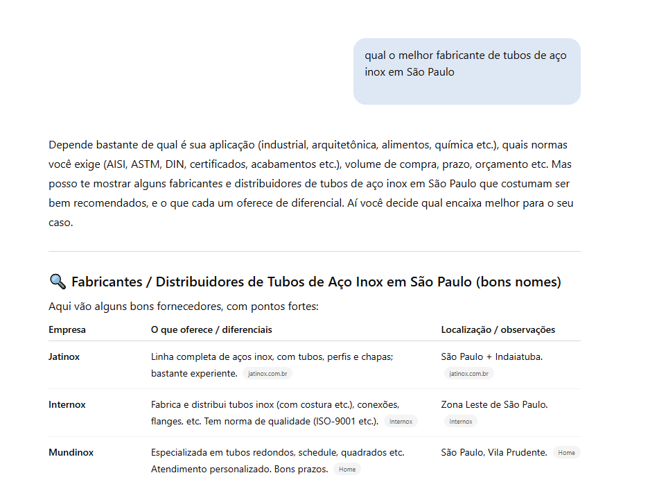 Nosso parceiro Mundinox sendo citado pelo ChatGPT